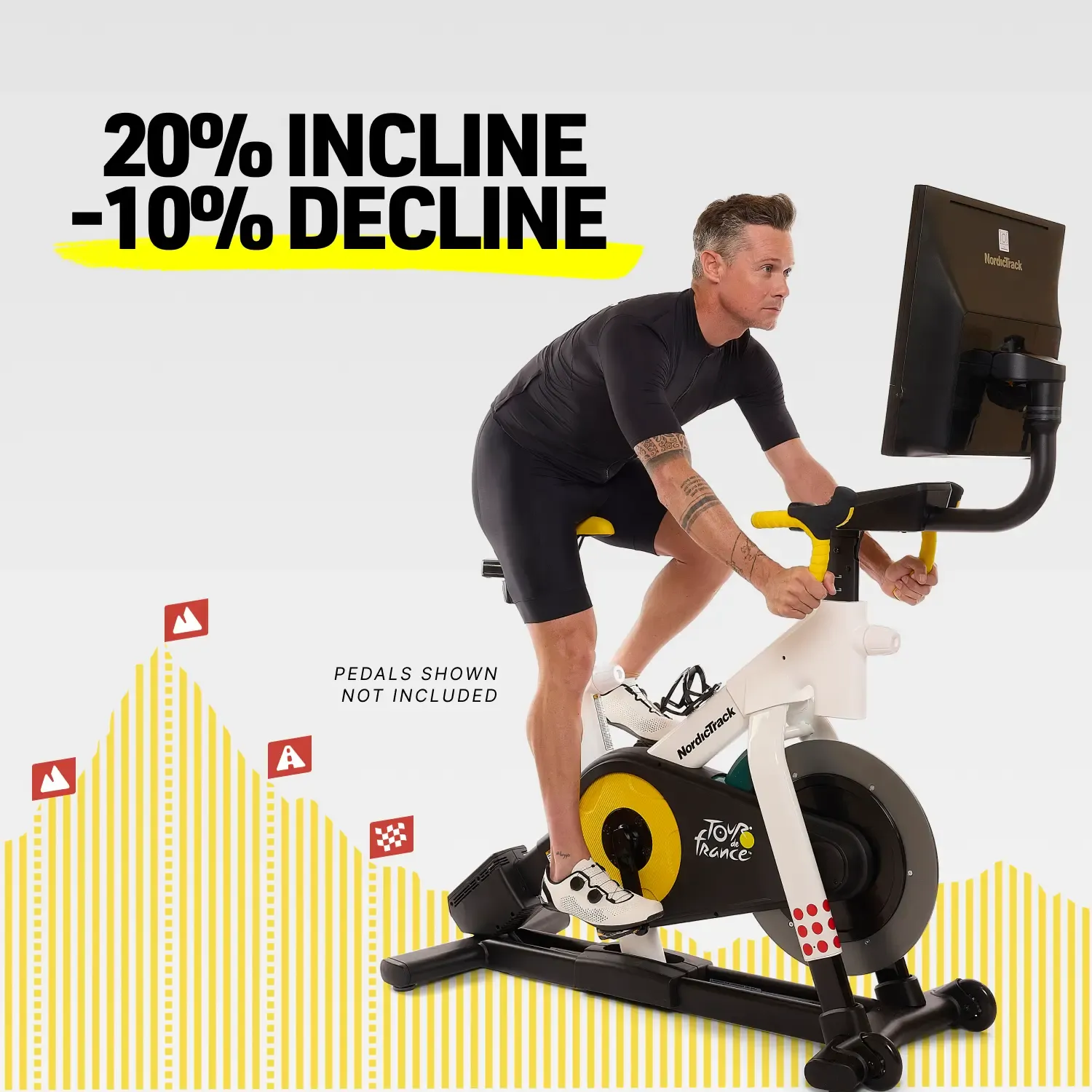The NordicTrack Tour de France Indoor Bike is designed to deliver a real road-cycling experience from home. With automatic incline and decline from -10% to 20%, it simulates outdoor climbs and descents for a more realistic and engaging ride. The bike features a freewheel design, digital gear shifting, and drop-style handlebars, allowing you to train like an actual road cyclist. The smooth flywheel and sturdy frame provide stability for high-intensity sessions.